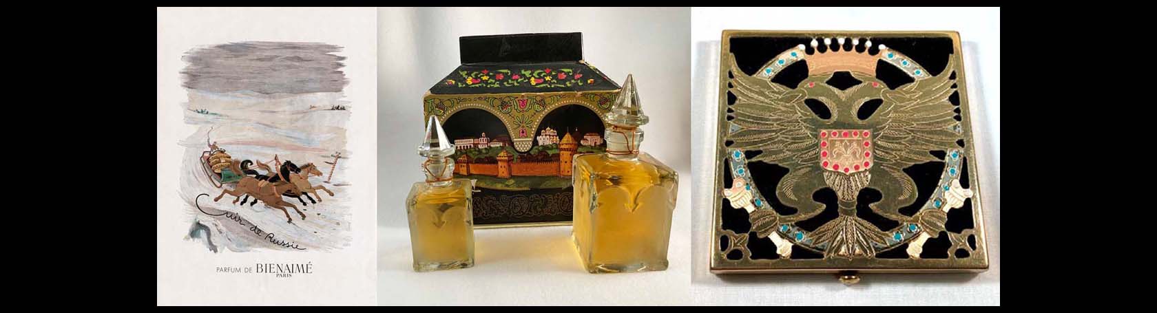 Have you ever dreamt of touring Russia? Wanted to see Moscow’s Red Square? Or view the Winter Palace or Fabergé Museum in St. Petersburg? Or perhaps you are interested in collecting perfume or vanity items produced in Russia? Perfume and vanity item makers have over the years evoked Russia with the popular fragrance of “Russian Leather” (aka Cuir de Russie or Juchten), references to the Troika (Russian version of the Pony Express was a sled pulled by teams of three horses), or images of the Russian emblem of a two-headed eagle or a Russian wolfhound (Borzoi).